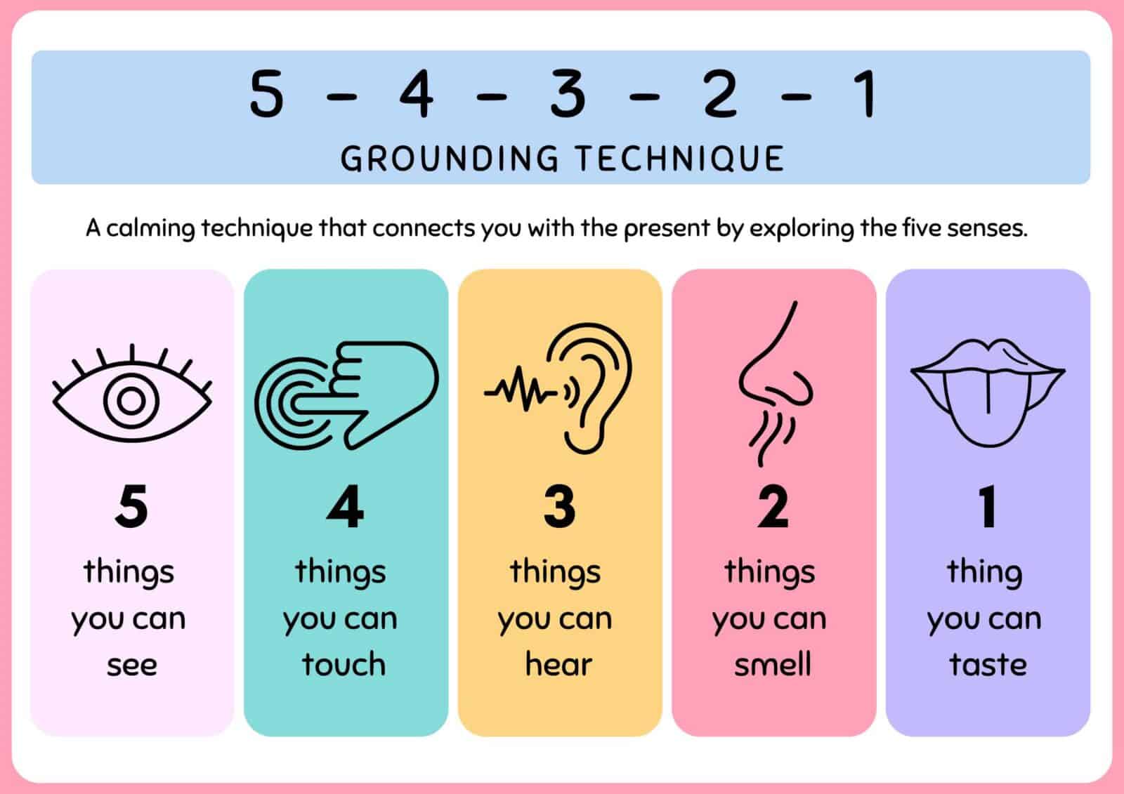 The University of Rochester reports that this is a classic grounding technique because it works so well. It guides you to notice the world around you using each of your senses. The process is simple:
