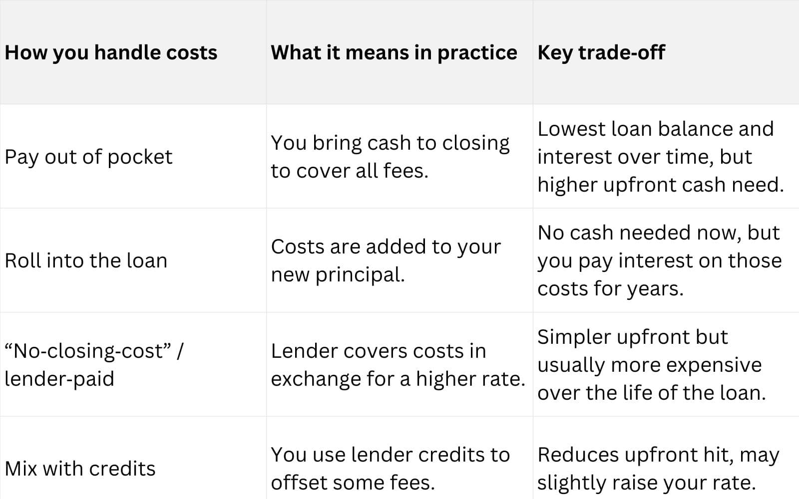 Closing costs donโt just affect your breakโeven; how you pay them changes the total cost of your new loan. Experian points out that refinance closing costs cover lender origination, appraisal, title services and more, and that โnoโclosingโcostโ loans still make you pay via a higher interest rate or by rolling costs into your balance. A 2026 refinance guide explains that you generally have four options: pay costs out of pocket at closing, add them to the new loan, accept a slightly higher rate in exchange for lenderโpaid costs, or use lender credits to offset some fees.